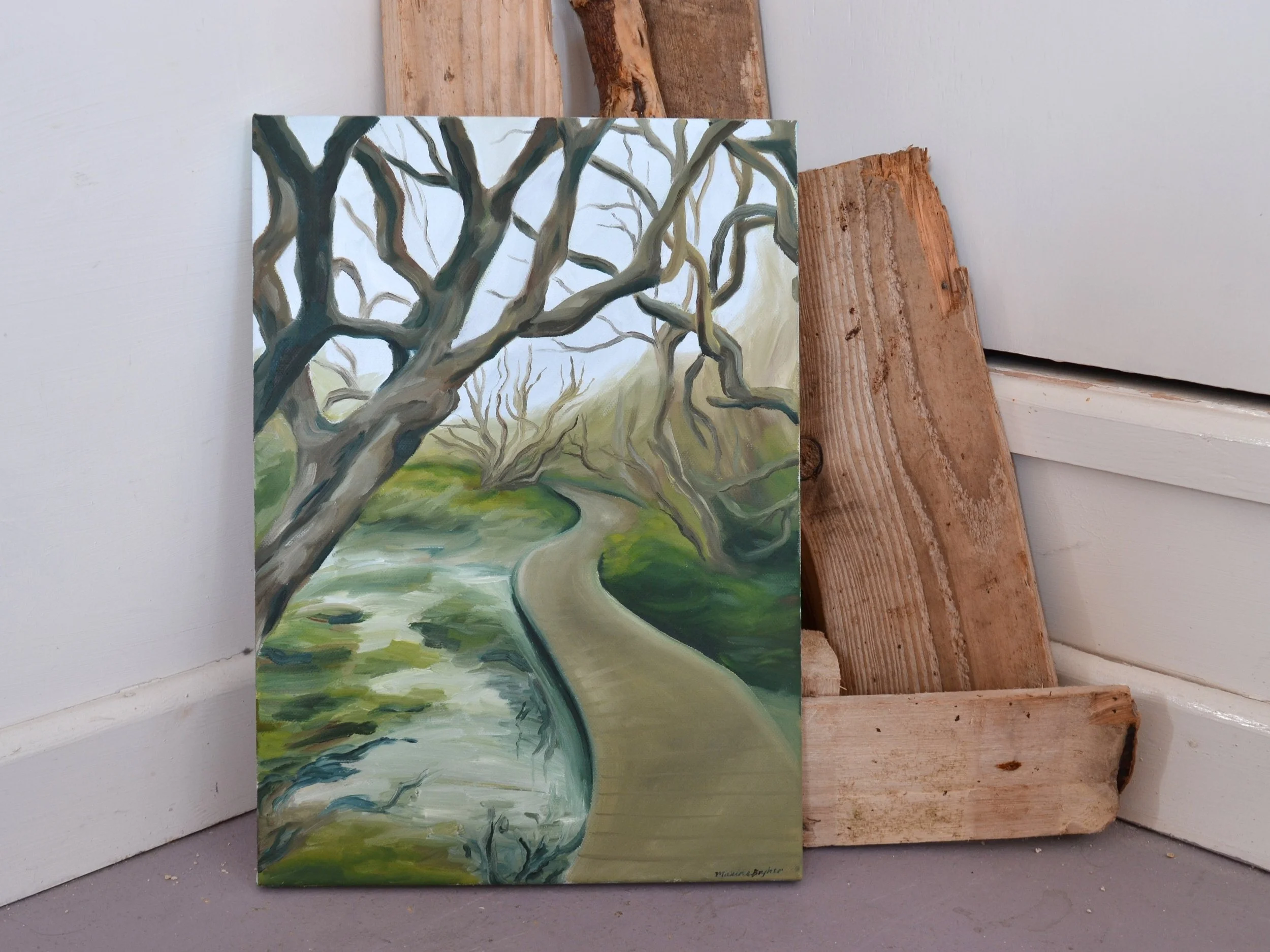 This painting captures the picturesque Old Town Graveyard on a sunny afternoon when the warm summer wind blows through, animating the scene. The lower half of the painting, long grasses sways in rhythmic waves around the still and motionless tombstones. The gust blows upwards to the canopy of trees, leaves painted in loose brushstrokes purposefully placed to swirl and sway like flames, making the invisible wind visible. Movement is further depicted in the dappled light across the across the pathway and highlighting the grass. Old Town church is nestled in the background, door open, inviting you in to the stillness of its interior.